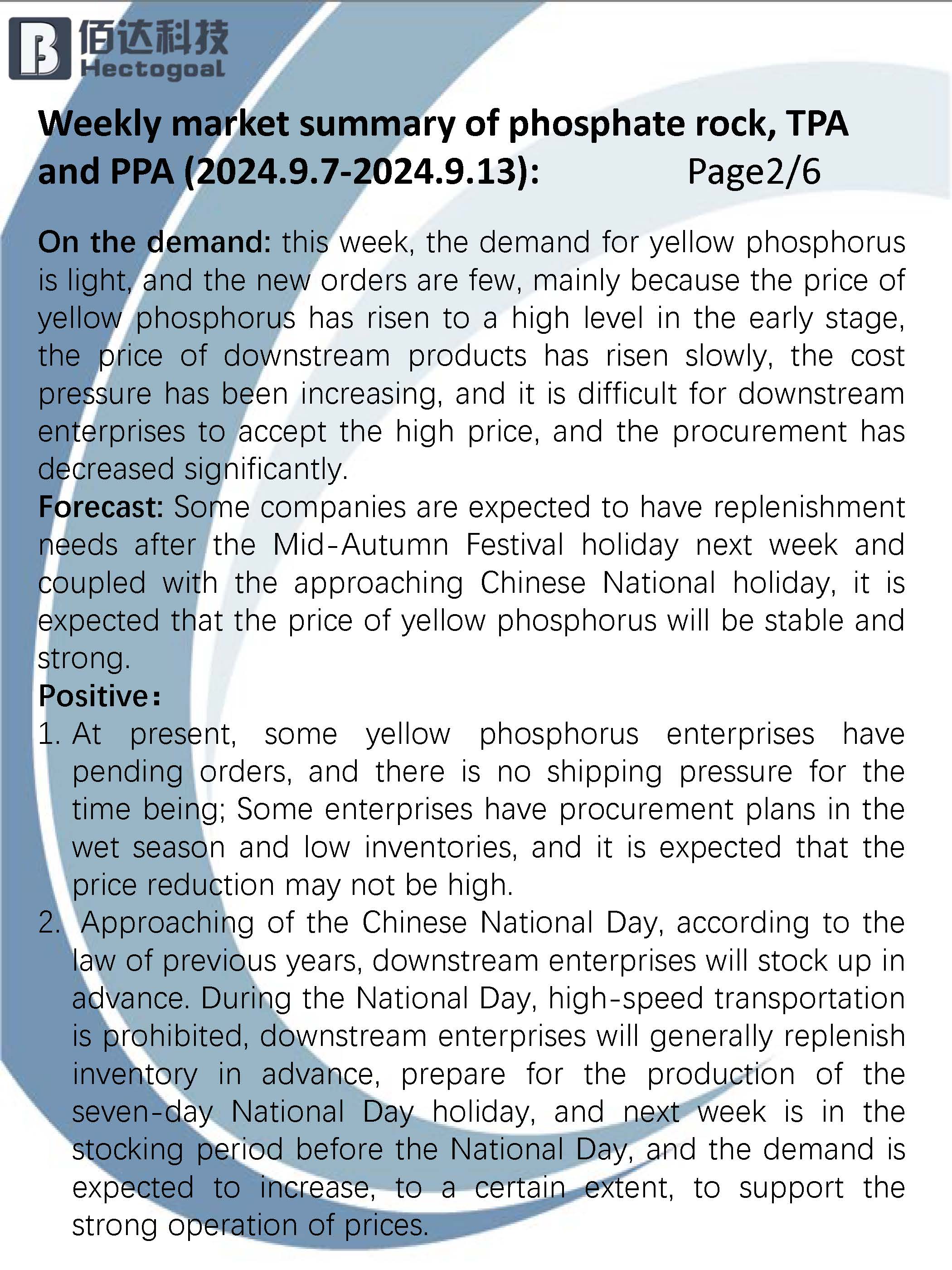 Forecast: Some companies are expected to have replenishment needs after the Mid-Autumn Festival holiday next week and coupled with the approaching Chinese National holiday, it is expected that the price of yellow phosphorus will be stable and strong.